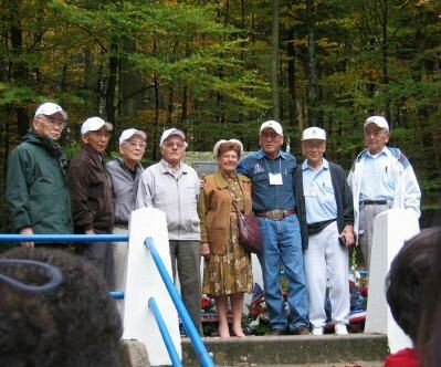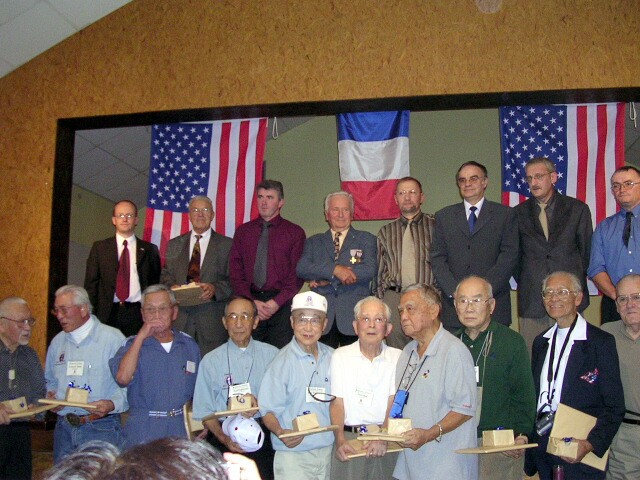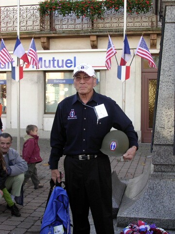 The towns of Bruyeres, Belmont, Biffontaine, and Fremifontaine were liberated in October 1944 by the 442nd RCT, comprised of Japanese Americans from Hawaii and Mainland United States, many from the 10 internment camps where 120,000 Japanese Americans were incarcerated. As in past years, all of the 53 persons in the delegation had similar objectives in going: to pay tribute to relatives and friends who were engaged for three weeks in the most bitter, non-stop fighting in which the 442nd RCT sustained more than 800 casualties. The seven 442nd veterans on this trip were Ted Fujimoto, Santa Ana, CA, Co. E; Roy Fujiwara, Seattle, WA, Co. L; Jimmie Kanaya, Gig Harbor, WA, 3rd Battalion Medical Specialist; Ted Oye, Seattle, WA, 3rd Battalion Headquarters; Lawson Sakai, Gilroy, CA, Co. E; Mike Tsuji, Los Angeles, CA, Co. H; and Willie Tanamachi, Houston, TX, who was in 442 nd training at the time. Some stood on the same spot they stood in October 1944 each with his own story to tell. Mike Tsuji pointed to the house where he spent one night. The festivities started on the first day, October 23, when 200 people of Fremifontaine, including resistance fighters with unit flags, honored the Japanese Americans with a band and speeches. The band played the American and French national anthems and Mayor Etienne Pourcher talked of how they were liberated by the Japanese Americans. Following that, about 300 residents of the town of Belmont invited the Japanese Americans for lunch and more celebratory speeches and entertainment. According to Greg Kimura of Palo Alto, California, “what happened next was overwhelming. A group of men dressed in WW II army fatigues and boots stepped up to the stage and sang God Bless America. Never had I witnessed this depth of honor and respect accorded to any group of people … here were these people singing God Bless America and honoring not just these Americans, these veterans, their friends and families, but America and all Americans. I've never been a particularly patriotic person, but at that moment I was truly proud to be an American”. From Belmont the visitors were taken to Biffontaine forests and toured the location, with all the grim evidence such as foxholes and shrapnel imbedded in trees, where 442nd Regimental Combat Team rescued the trapped 1st Battalion, 141st Regiment, 36th (Texas) Division (referred to by the press at the time as the “Lost Battalion”) in what the U.S. Army historical records recognized as one of the 10 most fiercely fought battles in its entire history. Jimmie Kanaya of Gig Harbor, Washington, who first saw the battle ground as a medic tending to the wounded during the battle, said “as I might not be around 10 years from now, I felt that it would be appropriate for me to pay my respects to those people of France, including the courageous French resistance movement whose contributions made a significant difference. The children in each community played a big part at the monuments as well as at the city squares by assisting in the laying of the wreaths. I thought this gesture on the part of the French people was one of the finest tributes they could pay those veterans who participated in their liberation, and to continue this tradition for years to come.” The highlights of the second day, October 24, began with mass at Bruyere's main church, where a memorial service was held in the Bruyeres town square. From there the Japanese Americans were taken to Helladraye forest riding in WWII jeeps and command cars, where a major battle for the liberation of Bruyeres occurred. The German Army was ordered to hold this position at all costs as this was the main rail line supporting the German troops on the western front. After two weeks of heavy fighting the enemy was defeated. On returning to Bruyeres, where a monument in honor the 442nd RCT was erected, over 400 town people took part in the celebration. Monuments have been similarly erected for the 45 th and 36 th Infantry Divisions. There were many school children waving French and American flags, French and American dignitaries, military and youth bands and a church choir which sang the Star Spangled Banner. All took part. Remembering a request made previously by the French, Sakai placed a WW II American soldier's helmet donated by the American Military Museum of Los Angeles on the top of the monument much to the pleasure of Bruyeres people. The front of the helmet bears the 442nd insignia painted on by retired Air Force Colonel Brian Shiroyama. The visitors were pleased to see that Bruyeres has named one of their streets, ”Rue de 442nd Regimental Combat Team.”