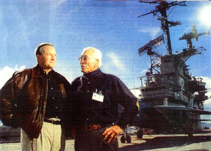 LAWSON SAKAI, right, head of E Company, 442nd RCT, and Scott Armanini, CEO of the USS Hornet Museum, stand on the flight deck of the USS Hornet in Alameda on Feb. 18. The Regimental Combat Team will create an exhibit on board. |