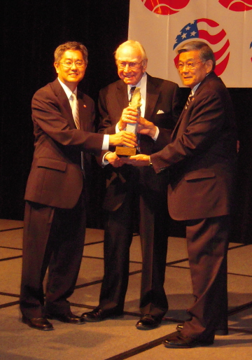 former congressman and Speaker of the House, Jim Wright with the Award for the Preservation of Constitutional Rights and a replica of the momument in Washington, D.C. Mineta had asked Wright to be a sponsor of the Redress Bill of 1988. Also standing is Craig Uchida, Chairman of the Board of the NJAM. |