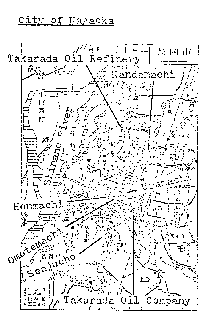 located on Omote Yonnomachi. At 320 Senjucho lived Kichimatsu Kishi. Ukichi might have moved from Omotemachi after the war fire of 1868 or after he became a banker. Kichimatsu and Hachitaro might have been born here. Taro and Toki were probably born here. Honmachi was wholesalers’ street. Saifukuji, Kishi’s family temple, was located in Honmachi Sanchome. On Knada Ichinomachi lived Masakichi Abe’s family. At 215 Ura Ichinomachi was Yakichi Omiya’s home. Admiral Isoroku Yamamoto’s birth home at 31 Gyokuzoinmachi cannot be found in this small map. This map was made as of 1933. [Orii, 1983] |